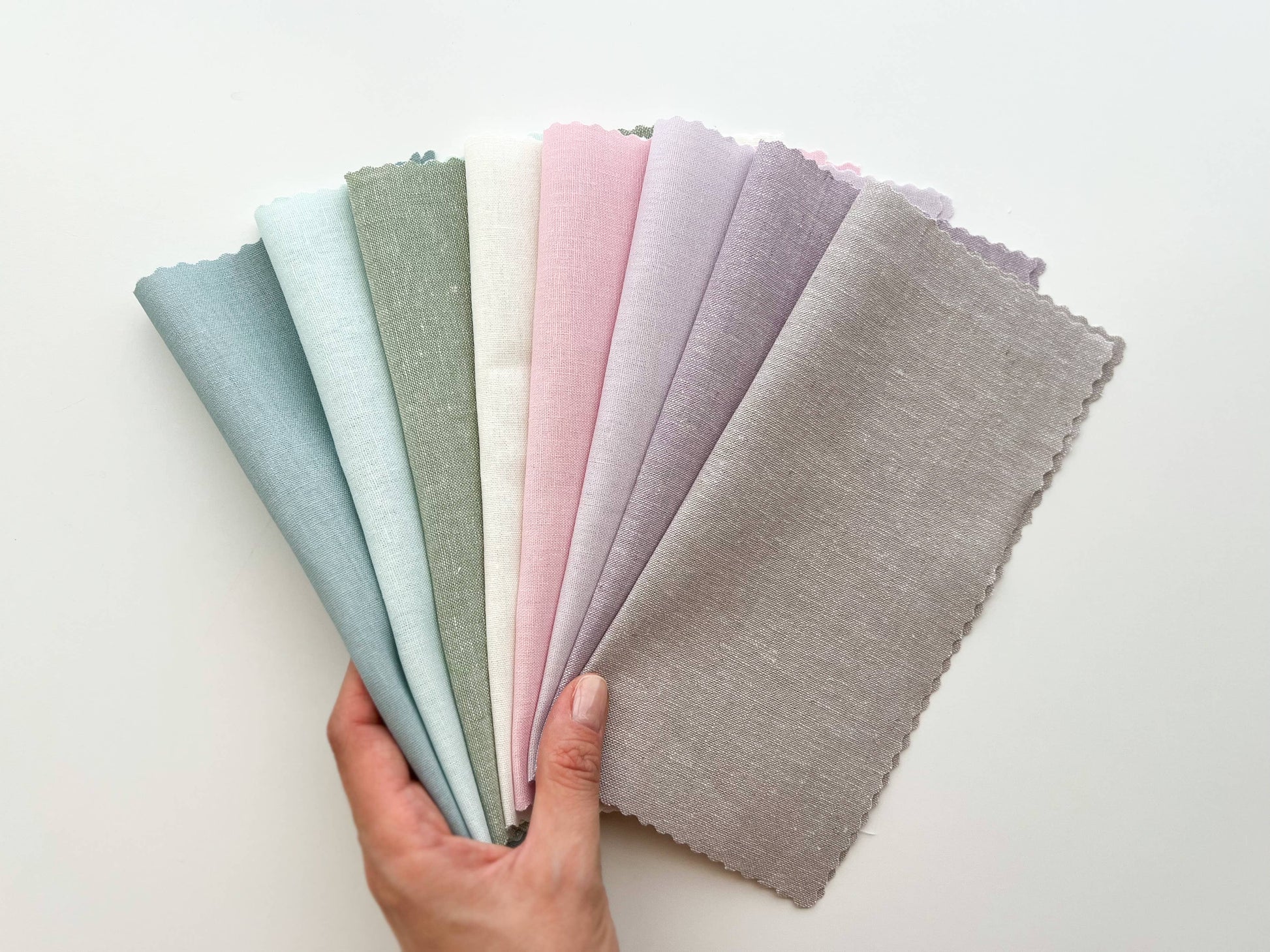 Embroidery fabric Sample Pack features 8 premium linen blend cuts in curated colors: cotton, powder blue, robin egg, sage, lavender, peony, ballerina and fog. Each fabric square measures 8” and will fit a standard 6” embroidery hoop.