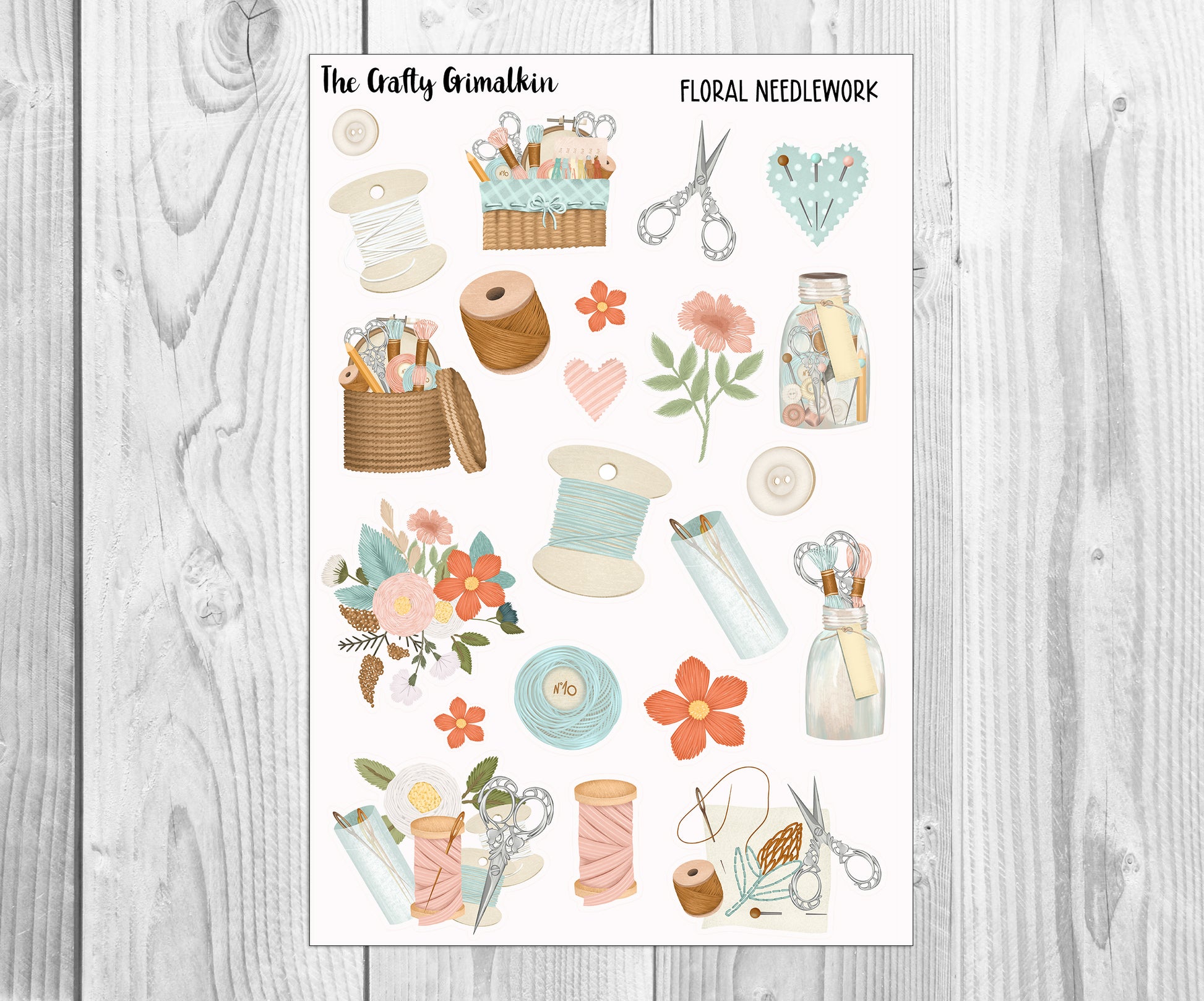 Floral Needlework/Cross Stitch Large Sticker Sheet for Journals, Scrapbooks or Planners
