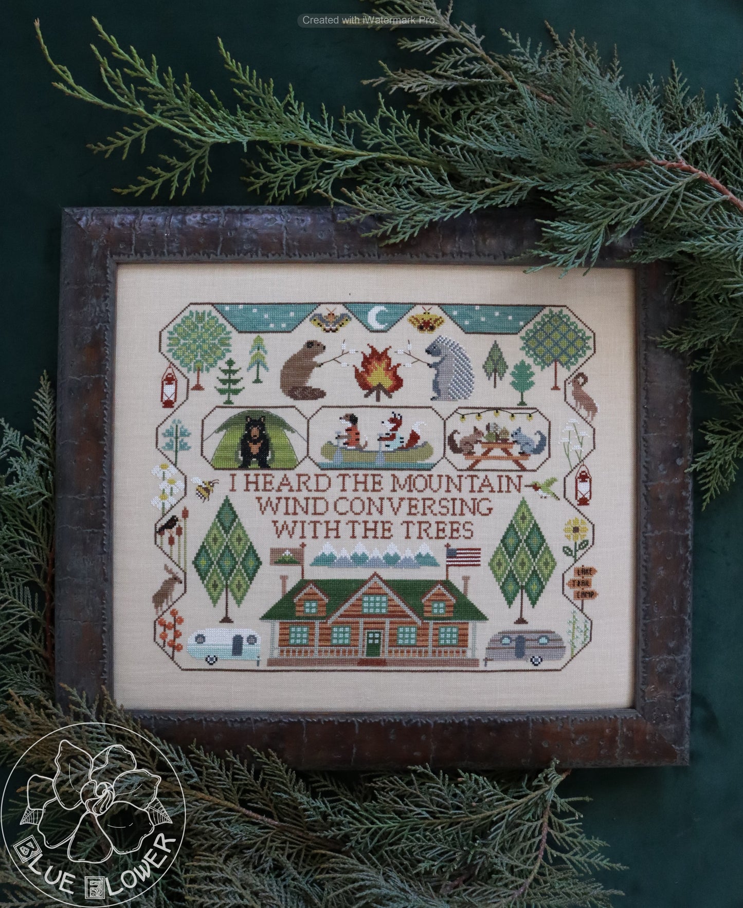 This design celebrates camping! Whether you prefer tents or campers, a lodge or a sleeping bag under the stars, there's something here for you. "I heard the mountain wind conversing with the trees"!