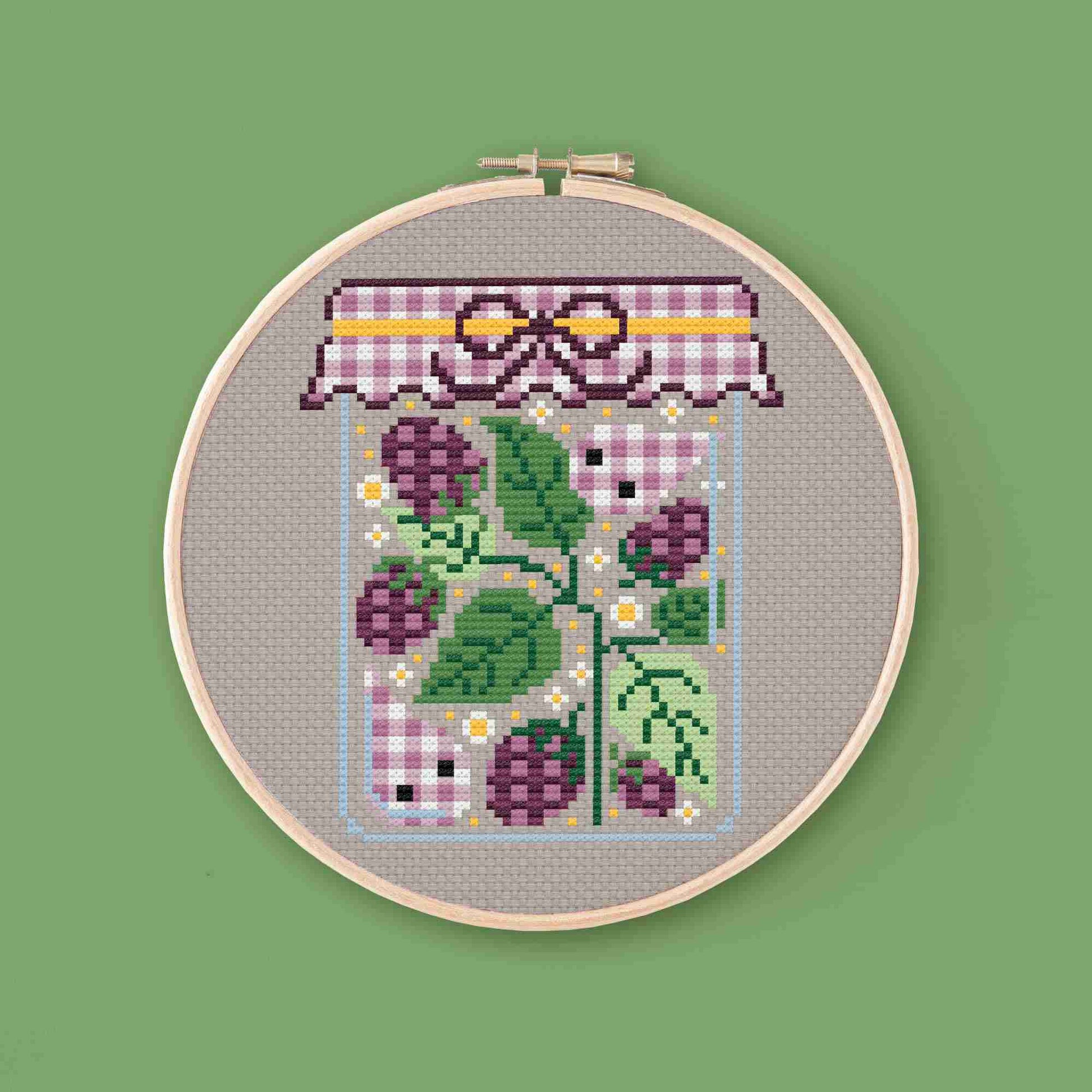Cross stitch pattern of an enchanted mason jar. This blackberry jar has been haunted by two little ghosts that now live there. This pattern is a cute and unique embroidery project that will make you happy to look at, it’s just so sweet!