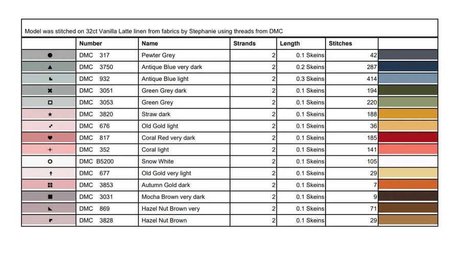 The models were stitched 2 over 2 on 32 count cream-colored evenweave using DMC threads. As always, feel free to customize fabric and floss colors to suit your style or décor.