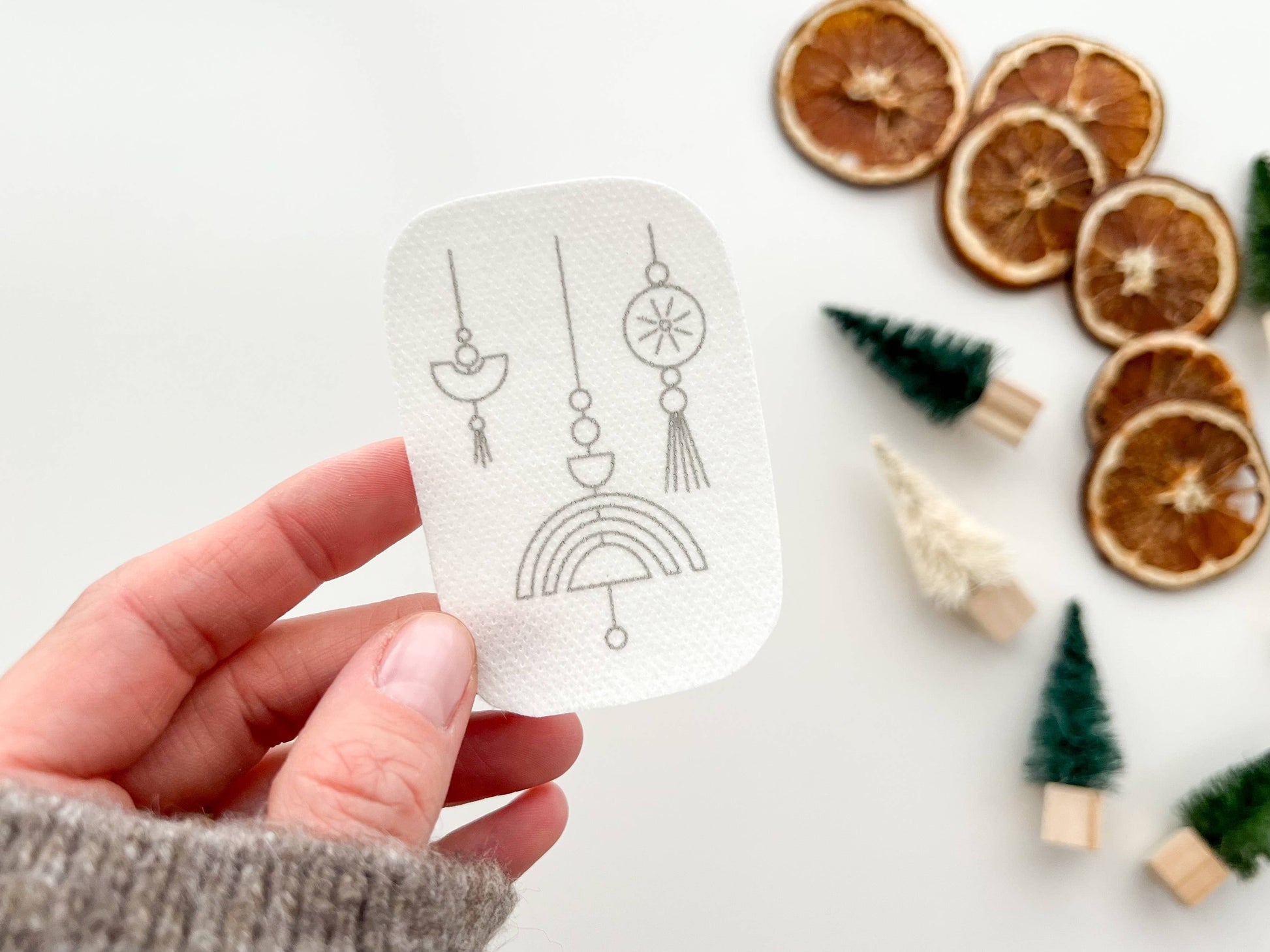 Designs are pre-printed on sticky washable stabilizer. Each one is a single-use pattern patch. Simply peel the backing off, stick the patch onto your project area and start stitching! When finished, soak in warm water to dissolve the paper, gently rub it off, and let dry.